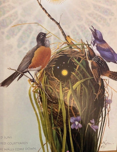 Editor’s Note: Steady readers of Dark Matter will likely recall my friend and neighbor Lynne McFarland who often does me the great kindness of permitting the reprinting of her online posts here. Even wondering what Lynne might say about something I’m looking at or considering restores my sense of myself and others and our sweet old world. I hope each of you has people like that in your life. The image above comes from Lynne too. It’s an illustration from The Illuminated Rumi, translated by Coleman Barks, illlustrations by Michael Green. Here’s Lynne.