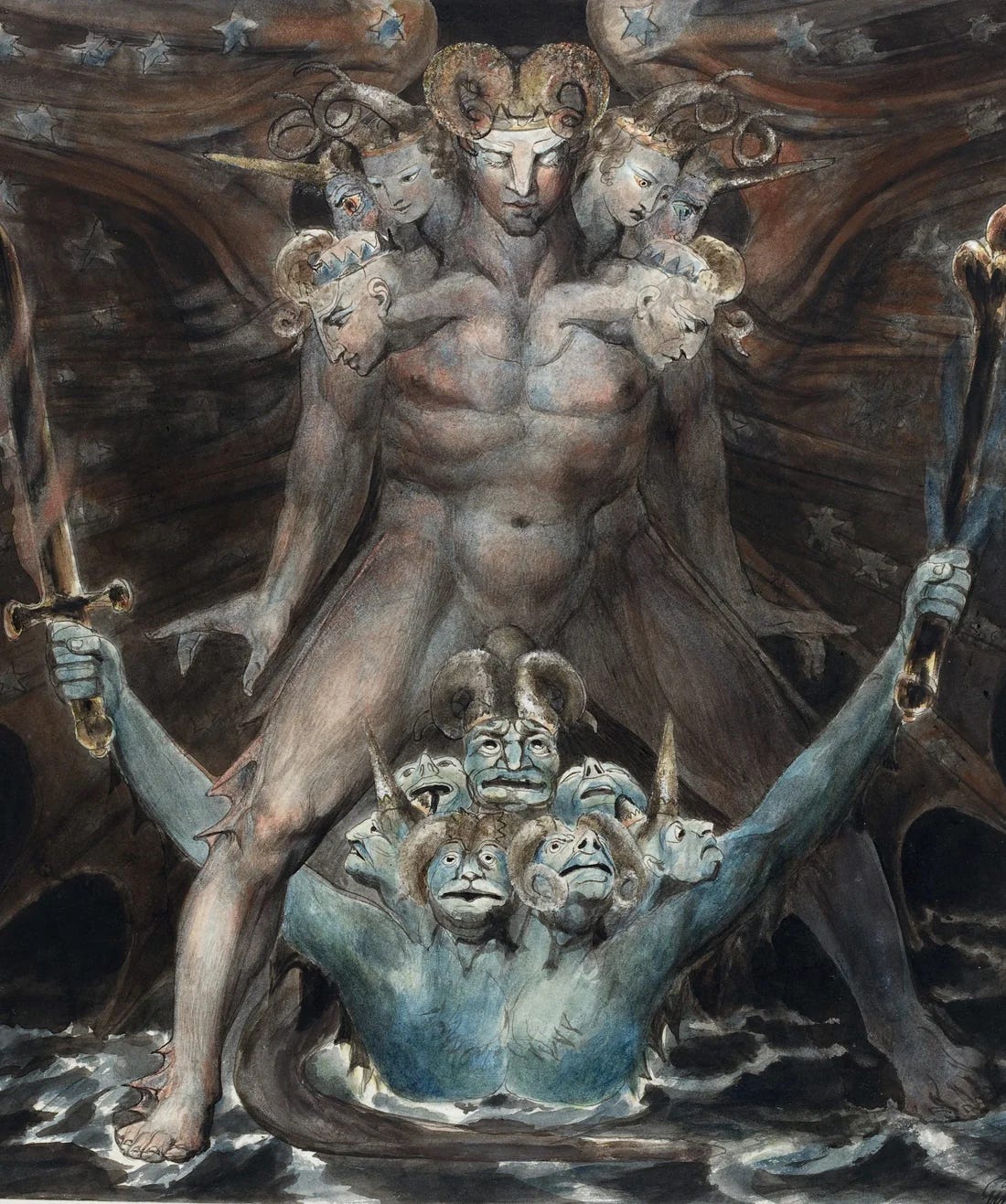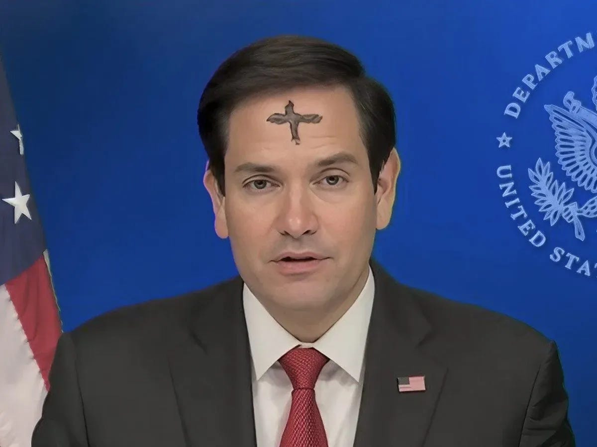 Editor’s note: The top image is William Blake’s “The Great Red Dragon and the Beast from the Sea.” The second image is Marco Rubio commemorating Ash Wednesday while also normalizing tax-funded horror on camera. The third image, captured by Roberto Schmidt, is Pam Bondi refusing to look at survivors of the Epstein cabal.
